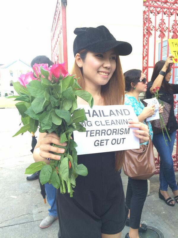 In der Umgebung sperrten Soldaten die Zugangswege ab, um ein Anwachsen der Menschenmenge zu verhindern. Am Sonntagabend gab die Junta warnend bekannt, weitere Demonstrationen würden nicht toleriert. Seit der Machtergreifung des sogenannten «Rats für nationalen Frieden und die Aufrechterhaltung der Ordnung» kam es zu mehreren kleineren Kundgebungen. Die Manifestanten wählten symbolträchtige Orte wie das Siegesdenkmal in Bangkok oder, wie am Sonntag, einen Platz unweit der Ratchaprasong-Kreuzung, wo die Armee 2010 Proteste von Anhängern des ehemaligen Regierungschefs Thaksin Shinawatra niedergeschlagen hatte.